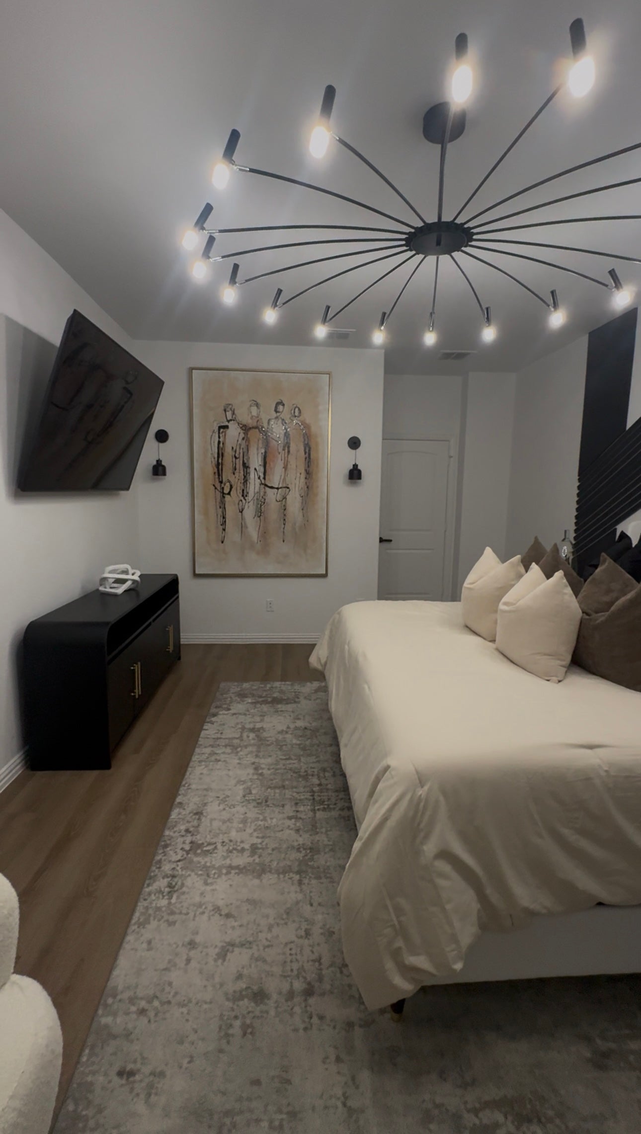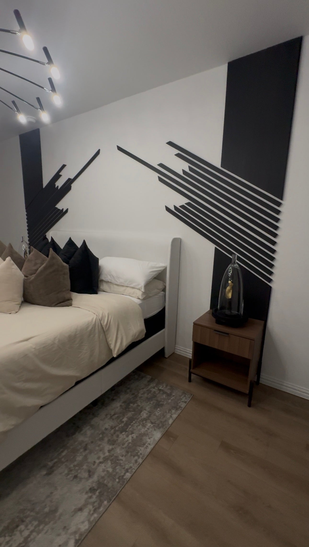 The master bedroom design employs a carefully curated neutral color palette, creating a serene and tranquil atmosphere. By utilizing soft, muted tones such as warm beiges, gentle grays, and subtle whites, the space exudes a sense of calm and relaxation. This thoughtful color selection serves a crucial purpose: to provide the client with a peaceful retreat after a demanding day at work.