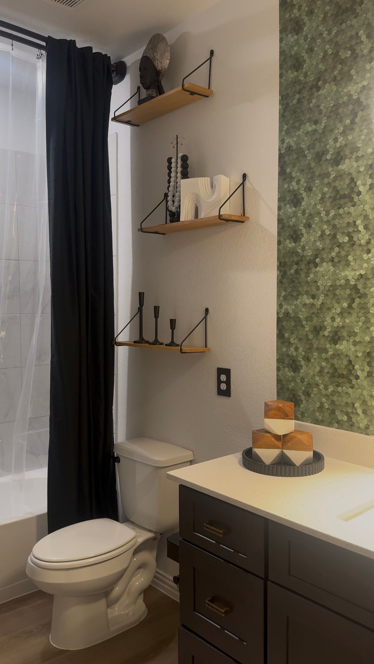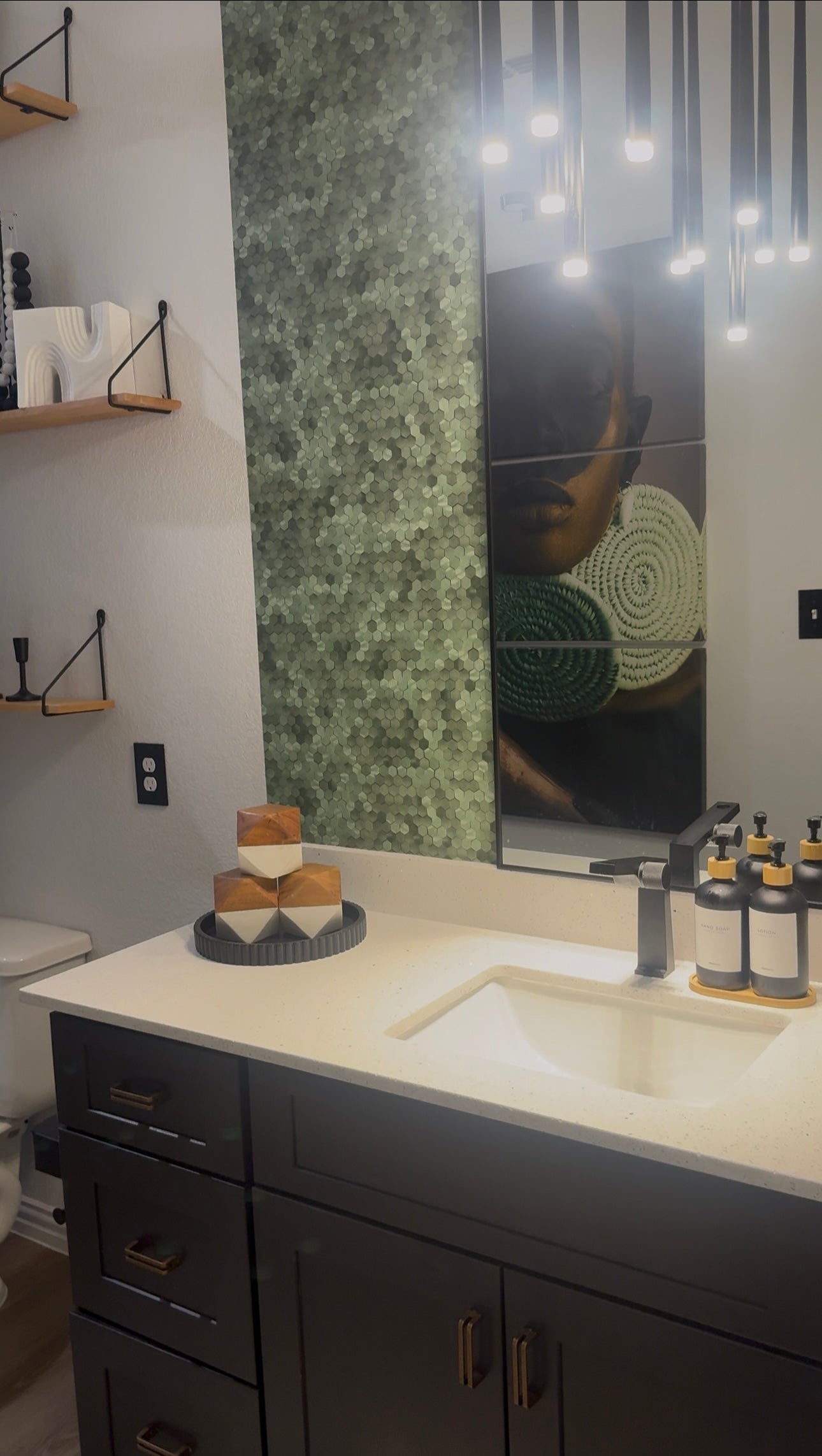 This guest bathroom showcases the client's African heritage through thoughtful design elements. (DMAID) skillfully incorporated a variety of patterns to create a visually striking and culturally significant space. The designers expertly balanced traditional African motifs with modern aesthetics, resulting in a unique and personalized bathroom environment.