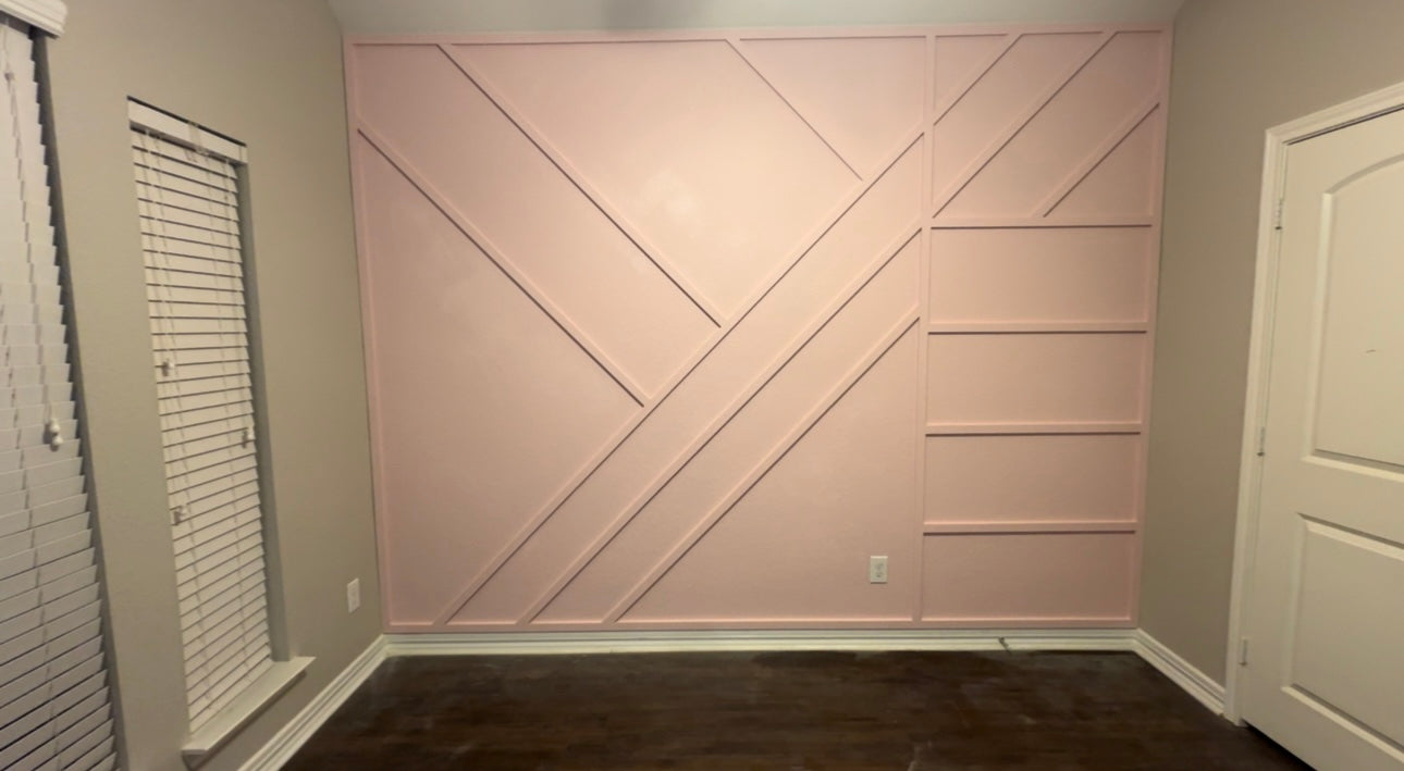 A soft, delicate pink accent wall serves as the focal point in this newly renovated nursery, perfectly designed for a family welcoming a baby girl. The gentle hue creates a soothing and inviting atmosphere, ideal for nurturing a newborn. This thoughtful design choice not only adds a touch of femininity but also introduces a subtle pop of color that can grow with the child.