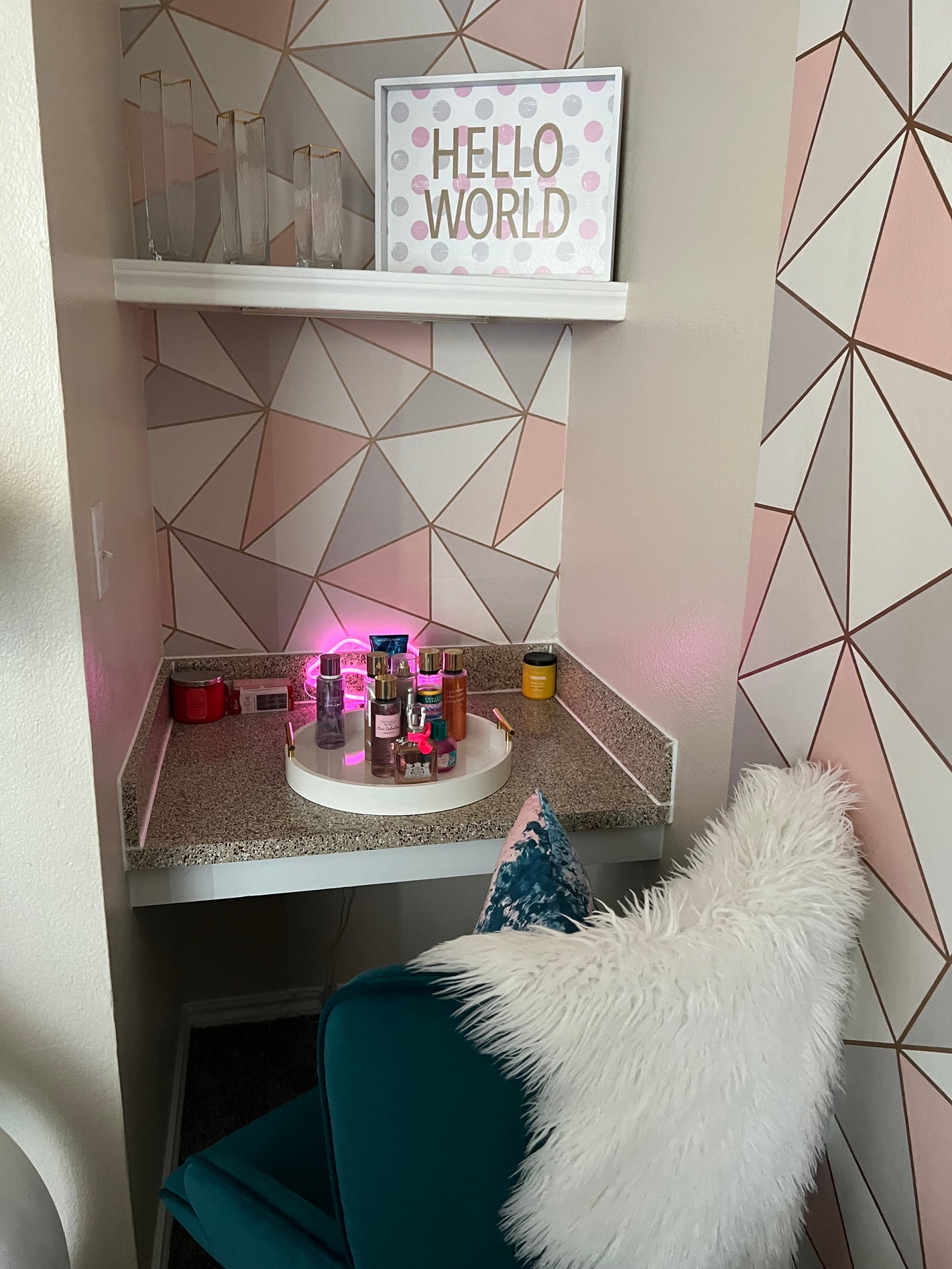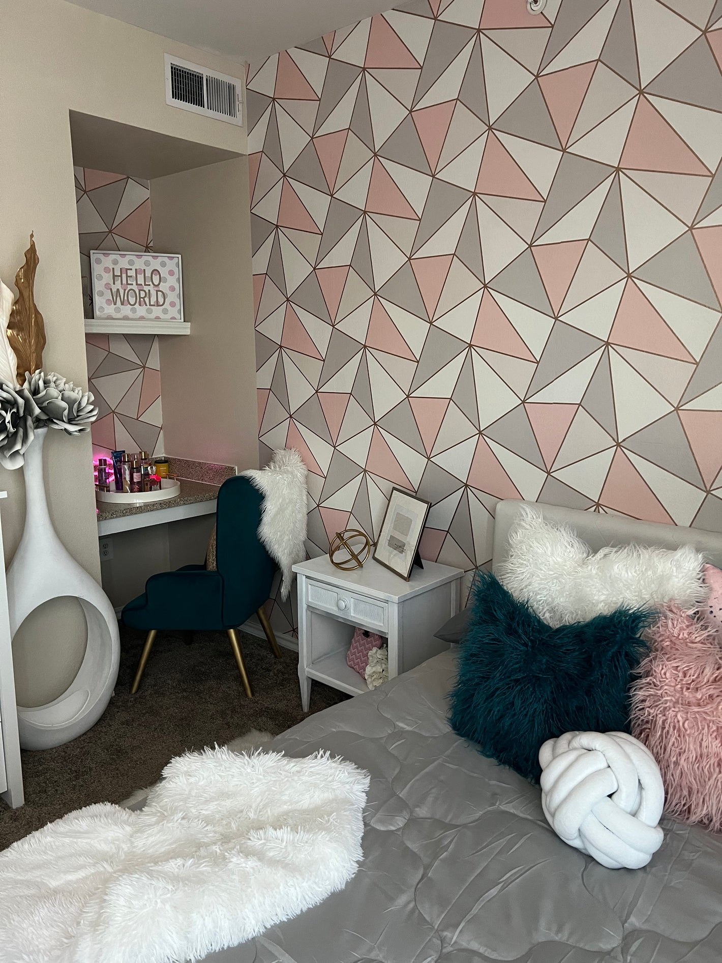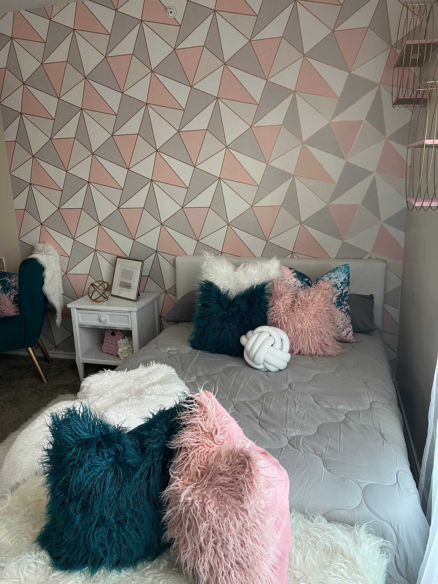 We transformed this teenager's wall from bare and dull to vibrant and captivating with the addition of an eye-catching wallpaper. The chosen design not only adds a pop of color and personality to the room but also creates a focal point that draws attention and sparks interest. The bold patterns and vibrant hues of the wallpaper create a lively and energetic atmosphere, perfectly complementing the youthful and dynamic vibe of the space